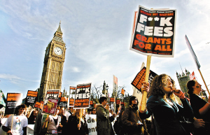 2006年10月29日,倫敦學(xué)生舉行了反對學(xué)費升高的游行活動。資料圖片 | 附加學(xué)費制為主因