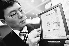 | 日前于北京舉行的第二屆中國數(shù)字出版博覽會上,工作人員在展示“電子紙”。范繼文