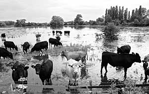 | 圖為7月23日在英國(guó)中部的牛津郡,牛群在洪水泛濫的草場(chǎng)吃草。新華社/法新 | 本報(bào)倫敦7月23日電