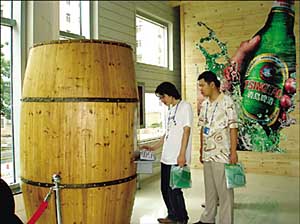 游客在青啤博物館內(nèi)參觀釀酒大桶。 | 日前,青島啤酒公司與世界旅游組織簽訂戰(zhàn)略合作協(xié)議,繼微軟之后,成為世界旅游組織的第二個合作伙伴。