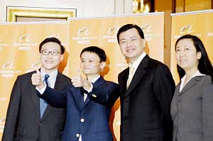 | 阿里巴巴首場(chǎng)路演儀式。從左至右:阿里巴巴集團(tuán)CFO蔡崇信,阿里巴巴集團(tuán)董事局主席馬云,阿里巴巴集團(tuán)執(zhí)行副總裁、B2B(電子商務(wù))總裁衛(wèi)哲、B2B公司CFO武衛(wèi)。本報(bào)記者