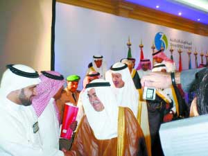 | 14日在新聞發(fā)布會開始前,沙特石油部長納伊米受到媒體“圍攻” 本報記者 朱周良