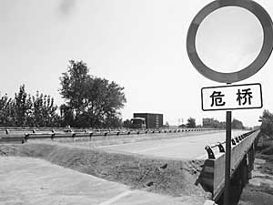 8月23日,河北邯大公路漳河大橋南橋因貨車嚴重超載,造成大橋過早“夭折”,被列為危橋禁止通行。王彬 攝 |
