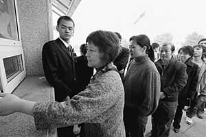 “上午3500,下午1500”,記者看到,在博物館門前發(fā)票處的窗口上,醒目地貼著每日參觀票的發(fā)放限額。當(dāng)日下午兩點半左右,博物館“下半場”開始,參觀者排著整齊的隊伍有序進場,當(dāng)門前還有三四十人時,發(fā)票暫停。保安解釋說:“3點鐘再發(fā),控制一下人數(shù)!迸抨牭娜藗兌夹钠綒夂偷氐戎,或翻看報紙,或三五成群地聊天。