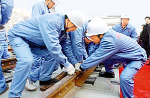 一般來(lái)說(shuō),23攝氏度是鋼軌鎖定的最佳溫度,可是工程恰好趕在了寒冬。“氣溫低對(duì)我們鋼軌鎖定技術(shù)提出了非常大的挑戰(zhàn),”中鐵二局股份公司副總經(jīng)理、京津城際項(xiàng)目部經(jīng)理王云波說(shuō),“我們?nèi)藶榘?500米的鋼軌拉伸了七八十厘米,再扣緊鎖定,由此保證了鋼軌一年四季的安全性。這在全世界都是絕無(wú)僅有的!