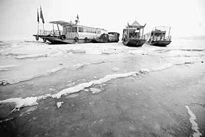 但從1月31日起,向陽碼頭至蓮花碼頭幾公里寬的水域全面出現(xiàn)冰封,所有輪渡以及20多艘快艇都結結實實凍在冰里,水上交通因此中斷。