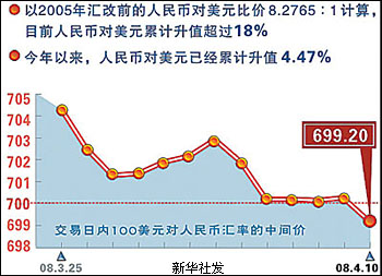 再從外因看,美元加速貶值,也推動了人民幣匯率較快升值。受次貸危機(jī)等因素影響,國際金融市場上美元不斷走貶。今年一季度,美元對日元最多時貶值13.3%,對歐元最多時貶值7.5%。由于人民幣匯率參考一籃子貨幣進(jìn)行調(diào)節(jié),在一籃子貨幣中,大頭還是美元。美元持續(xù)貶值,人民幣就會不斷升值。