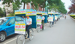 | 8月31日,濟(jì)南“萬人購房團(tuán)”發(fā)起人在泉城路開展廣告宣傳活動。本報(bào)記者