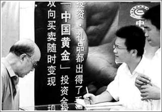 一年開(kāi)設(shè)47家分公司,這是寶鑫金業(yè)創(chuàng)造的布點(diǎn)速度。 成立于2006年9月的寶鑫金業(yè),是一家注冊(cè)資本500萬(wàn)元,經(jīng)營(yíng)范圍涵蓋黃金、鉑金飾品的加工、銷(xiāo)售,珠寶、玉器的銷(xiāo)售以及黃金交易代理及咨詢服務(wù)的新企業(yè)。 這樣一家名不見(jiàn)經(jīng)傳的公司,為何能快速布點(diǎn)并誘導(dǎo)大量投資者“上鉤”呢?記者調(diào)查發(fā)現(xiàn),這主要是因?yàn)閷汌谓饦I(yè)惡意利用了三大“誘餌”: 誘餌一——企業(yè)品牌!案]x”品牌創(chuàng)建于1984年。公司下設(shè)六家專業(yè)首飾生產(chǎn)加工基地和一個(gè)檢測(cè)中心,已形成集團(tuán)化、專業(yè)化的珠寶首飾加工、出口、內(nèi)銷(xiāo)的經(jīng)營(yíng)網(wǎng)絡(luò),是國(guó)內(nèi)首家在港上市的珠寶企業(yè),也是上海黃金交易所綜合類(lèi)會(huì)員單位。為取得投資者的信任,寶鑫金業(yè)在“客戶協(xié)議書(shū)”中大肆宣傳所謂的“福輝標(biāo)準(zhǔn)金延期交收業(yè)務(wù)”,給人此項(xiàng)業(yè)務(wù)與福輝公司密切相關(guān)的誤導(dǎo)。對(duì)此,福輝公司強(qiáng)調(diào),公司并無(wú)此項(xiàng)業(yè)務(wù)。 誘餌二——公司授權(quán)。為使投資者深信不疑,寶鑫金業(yè)特別將福輝公司的“授權(quán)書(shū)”放在“客戶協(xié)議書(shū)”的突出位置!笆跈(quán)書(shū)”稱:“茲授予福建省寶鑫金業(yè)有限公司代理福建省福輝珠寶有限公司開(kāi)展上海黃金交易所黃金延期交收及咨詢業(yè)務(wù)。時(shí)間為2007年3月1日至2008年2月28日!蓖顿Y者也因此打消了顧慮。 誘餌三——辦公場(chǎng)所。為了制造“福輝和寶鑫是合作伙伴”的假象,寶鑫金業(yè)還租下了福輝珠寶城四樓A區(qū)的辦公場(chǎng)地,設(shè)立了“寶鑫黃金交易中心”,從事所謂“福輝標(biāo)準(zhǔn)金延時(shí)交收業(yè)務(wù)”的交收及咨詢業(yè)務(wù)。許多投資者正是到現(xiàn)場(chǎng)參觀后,才充分相信寶鑫公司,并大膽參與此項(xiàng)投資。