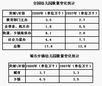 來自同一數(shù)據(jù)源的另一組數(shù)據(jù)表明,城市幼兒園的數(shù)量由2000年的3.7萬個(gè),下降到2007年的3.3萬個(gè),鄉(xiāng)鎮(zhèn)幼兒園從2000年的4.5萬個(gè),下降到2007年的3.5萬個(gè)。無論是城市還是鄉(xiāng)鎮(zhèn),幼兒園的數(shù)量都在減少。