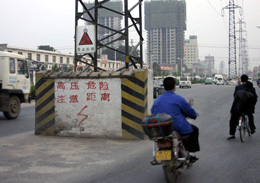 10月17日,在西安市朱宏路,一排電線桿“霸道”地分布在機(jī)動(dòng)車道中央。 西安市一些街道拓寬改造之后,電線桿卻沒有及時(shí)挪移,形成交通安全隱患,在夜晚、雨霧等視線不良的條件下時(shí)常引發(fā)交通事故。