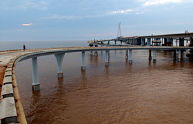 寧波港是我國(guó)國(guó)際集裝箱運(yùn)輸?shù)母删港,又是上海國(guó)際航運(yùn)中心的重要一員。根據(jù)國(guó)家規(guī)劃,上海國(guó)際航運(yùn)中心由洋山港與長(zhǎng)江沿岸港口和寧波港三者組成,功能互補(bǔ),是上海國(guó)際航運(yùn)中心的“中心兩翼”。然而由于杭州灣的阻隔,寧波港與上海港、太倉(cāng)港交通不便,不利于三港優(yōu)勢(shì)疊加和功能互補(bǔ)。 大橋建成后,杭州灣南岸的寧波、紹興和臺(tái)州等地到上海港、洋山港的距離均有不同程度縮短。寧波市港口局副局長(zhǎng)孫時(shí)光表示,杭州灣跨海大橋的貫通,對(duì)寧波港口來(lái)講,既是機(jī)遇也是挑戰(zhàn)。孫時(shí)光認(rèn)為,從長(zhǎng)遠(yuǎn)看,寧波港和上海港優(yōu)勢(shì)互補(bǔ)各呈所長(zhǎng)。現(xiàn)寧波港有80多條國(guó)際航線,上海港有120多條國(guó)際航線。杭州灣大橋的貫通,環(huán)杭州灣及周邊地區(qū)的出口企業(yè),也有了更多的國(guó)際航線和更便捷運(yùn)輸路線的選擇余地。 據(jù)介紹,以往溫州、臺(tái)州一帶到上海的貨物,基本通過(guò)杭州線路運(yùn)達(dá)。杭州灣大橋建成后,每標(biāo)箱經(jīng)由杭州灣大橋要比走滬杭高速節(jié)省運(yùn)費(fèi)1500元左右。另一方面,蘇南和浙北地區(qū)的貨物流向也可能發(fā)生變化。杭州灣大橋建成后,蘇南到寧波北侖港的運(yùn)輸距離也相應(yīng)縮短了120公里,使這些地區(qū)的貨物進(jìn)出口增加了一個(gè)與上海港相類似的口岸。 而與大上海隔海相望的寧波港與舟山港,通過(guò)杭州灣跨海大橋與上海的蘆潮港相通,再通過(guò)上海東海大橋與大小洋山港相連,串起了中國(guó)長(zhǎng)江出?诮_B運(yùn)“T”字型的黃金海岸。有數(shù)據(jù)顯示,2006年,上海港實(shí)現(xiàn)吞吐量4.7億噸、集裝箱2171萬(wàn)標(biāo)箱;寧波-舟山港總吞吐量4.2億噸、集裝箱712萬(wàn)標(biāo)箱。從港口吞吐量規(guī)模而言,上海港、寧波-舟山港已分別位居全球第一和第三的位置。據(jù)介紹,現(xiàn)舟山港-寧波港-杭州灣跨海大橋-蘆潮港-東海大橋-大小洋山港,已成為中國(guó)乃至世界上最大的港口群。而杭州灣跨海大橋則處在一線牽?jī)砂兜年P(guān)鍵環(huán)節(jié)。