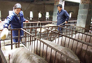 | 8月15日,安徽省淮北市烈山區(qū)古饒鎮(zhèn)一家養(yǎng)豬場的養(yǎng)殖戶正在給育肥豬喂食。為提高養(yǎng)殖戶的積極性,盡快保證生豬市場供應(yīng),國家財(cái)政從2007年起,實(shí)施能繁母豬補(bǔ)貼政策,按每頭50元的補(bǔ)貼標(biāo)準(zhǔn),對(duì)飼養(yǎng)能繁母豬的養(yǎng)殖戶(場)給予補(bǔ)貼。本報(bào)資料照片 | 肉價(jià)飆升并未調(diào)動(dòng)養(yǎng)殖熱情