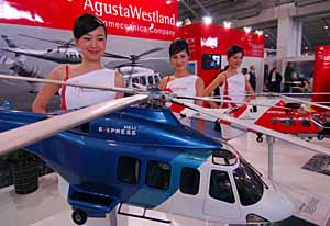 | 9月19日,幾名模特展示直升機的模型。當日,第十二屆北京國際航空展覽會開幕。新華社記者 王建華