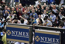 2008年1月2日,在紐約商品交易所交易大廳內(nèi),報價聲、尖叫聲不絕于耳。新華社記者在現(xiàn)場看到,隨著油價的暴漲,交易大廳內(nèi)顯得比平時更加擁擠。當(dāng)天中午12點10分左右,紐約油價瞬間沖至每桶100美元大關(guān),創(chuàng)下了歷史新紀(jì)錄。 由于近來非洲主要產(chǎn)油國尼日利亞國內(nèi)局勢持續(xù)動蕩和市場傳聞美國原油庫存可能進(jìn)一步下滑,國際油價在新年第一個交易日里便大幅飆升。[詳情] | |