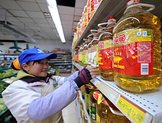 | 拉薩一家超市的售貨員在整理食用油柜臺。新華社記者 覺果