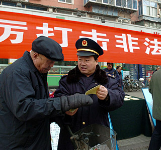 | 太原市工商局杏花嶺分局的工作人員在向市民介紹非法傳銷的危害。新華社記者