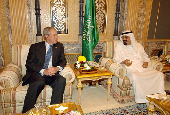 | 沙特國王阿卜杜拉(右)日前在利雅得與美國總統(tǒng)布什主要就加強雙邊關系和國際油價、伊朗核計劃等共同關心的熱點問題進行了探討。新華社/沙特通訊社 |