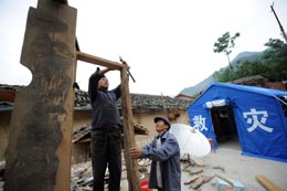 5月21日,隴南市武都區(qū)楓相鄉(xiāng)楓相塬村受災(zāi)群眾在用從廢墟中揀出來(lái)的木頭搭建防震棚。 地震發(fā)生后,甘肅省隴南市武都區(qū)受災(zāi)群眾在政府和社會(huì)各界的幫助下,積極展開生產(chǎn)自救,清掃廢墟,重建家園。新華社記者:聶建江