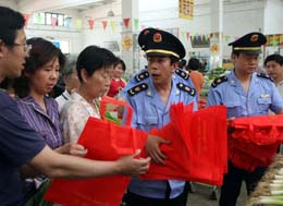 5月28日,北京德勝工商所工作人員在天秀農(nóng)貿(mào)市場發(fā)放倡導(dǎo)環(huán)保理念的免費購物袋。當(dāng)日,北京市西城區(qū)工商檢查人員深入轄區(qū)內(nèi)各集貿(mào)市場,宣傳即將于2008年6月1日起實施的“限塑令”。新華社記者:張旭