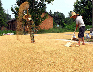 | 江西新建縣村民在晾曬剛收獲的早稻。本報記者 周科
