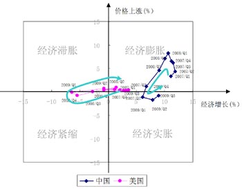 2007年中國(guó)處于經(jīng)濟(jì)增長(zhǎng)、價(jià)格上漲的“經(jīng)濟(jì)膨脹”,2008年受世界經(jīng)濟(jì)危機(jī)影響,中國(guó)四個(gè)季度經(jīng)濟(jì)增長(zhǎng)速度與物價(jià)變化均呈現(xiàn)不斷下降的趨勢(shì),似乎要轉(zhuǎn)向經(jīng)濟(jì)下滑、價(jià)格下降的“經(jīng)濟(jì)緊縮”。不過(guò),在中國(guó)采取大規(guī)模擴(kuò)張政策后,這種經(jīng)濟(jì)下滑的趨勢(shì)被扼制。從2009年二季度起,中國(guó)經(jīng)濟(jì)增長(zhǎng)開(kāi)始反彈。然而,擴(kuò)張政策沒(méi)有使經(jīng)濟(jì)轉(zhuǎn)向預(yù)期的經(jīng)濟(jì)膨脹。相反,在全球經(jīng)濟(jì)危機(jī)、世界市場(chǎng)萎縮的情況下,比正常年份超出一倍多的過(guò)量投資加劇了生產(chǎn)過(guò)剩,市場(chǎng)供給大于需求,市場(chǎng)價(jià)格下滑,轉(zhuǎn)而進(jìn)入經(jīng)濟(jì)增長(zhǎng)、價(jià)格下降為特征的“經(jīng)濟(jì)實(shí)脹”。2007-2009年,中國(guó)經(jīng)濟(jì)經(jīng)歷了“經(jīng)濟(jì)膨脹→經(jīng)濟(jì)實(shí)脹→經(jīng)濟(jì)復(fù)蘇”的轉(zhuǎn)變過(guò)程,而經(jīng)濟(jì)復(fù)蘇的程度關(guān)鍵看2009年第四季度中國(guó)的價(jià)格能否轉(zhuǎn)向正增長(zhǎng)。
