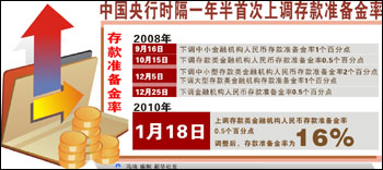 新年首周信貸的爆發(fā)式增長(zhǎng)讓央行提早出手。12日晚間,央行宣布,自1月18日起,上調(diào)存款準(zhǔn)備金率0.5個(gè)百分點(diǎn)。以2009年11月底59.27萬(wàn)億人民幣存款余額估算,同時(shí)考慮農(nóng)村信用社等小型金融機(jī)構(gòu)暫不上調(diào)因素,分析師預(yù)計(jì)這將回收2500億基礎(chǔ)貨幣。而且,由于央行上調(diào)時(shí)點(diǎn)早于預(yù)期,預(yù)計(jì)將對(duì)市場(chǎng)產(chǎn)生強(qiáng)烈緊縮預(yù)期。 同日,在例行的公開市場(chǎng)操作中,央行還提高了一年期央票發(fā)行利率8.29個(gè)基點(diǎn)。當(dāng)日,發(fā)行了200億元一年期票據(jù),同時(shí)進(jìn)行了2000億元28天正回購(gòu)操作,共回籠資金2200億元。一年期票據(jù)發(fā)行價(jià)格為98.19元,參考收益率為1.8434%。該利率結(jié)束去年8月11日以來(lái)的持平局面,較原先的1.7605%上漲了8.29個(gè)基點(diǎn)。在此前的上周四,央行已經(jīng)提高了三個(gè)月期央票的發(fā)行利率4個(gè)基點(diǎn),同時(shí)提高了91天正回購(gòu)的利率3個(gè)基點(diǎn)。