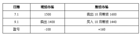 套期保值在現(xiàn)貨市場和期貨市場對同一種類的商品同時進(jìn)行數(shù)量相等但方向相反的買賣活動,即在買進(jìn)或賣出實貨的同時,在期貨市場上賣出或買進(jìn)同等數(shù)量的期貨,經(jīng)過一段時間,當(dāng)價格變動使現(xiàn)貨買賣上出現(xiàn)的盈虧時,可由期貨交易上的虧盈得到抵消或彌補,這就是我們通常所說的風(fēng)險對沖。 我們以最簡單的例子來看一下套期保值的功能。假設(shè)某芝加哥的糧食貿(mào)易商在收獲季節(jié)采購小麥,7月1日從農(nóng)場主手中采購現(xiàn)貨,市場價格為1500元/噸,該貿(mào)易商為防止未來賣出時價格下跌,他同時在芝加哥期貨市場上賣出10月期貨合約做套期保值,價格為1600元/噸;到了9月1日時,現(xiàn)貨市場價格為1400元/噸,期貨市場上價格為1440元/噸,貿(mào)易商在這個時候平倉的話,將在現(xiàn)貨市場上每噸損失100元,而在期貨市場上每噸盈利160元,這樣現(xiàn)貨市場上價格下跌的風(fēng)險就由期貨市場上的盈利彌補了,貿(mào)易商還賺了60元。其盈虧收益如表所示: