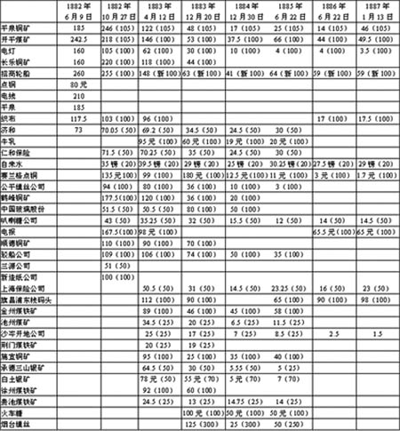 1840年后,西方新型股份制企業(yè)的組織方式,隨著鴉片戰(zhàn)爭后的資本主義勢力進(jìn)入了中國,對中國近代新式工商企業(yè)的創(chuàng)辦,產(chǎn)生了相當(dāng)大的刺激和借鑒作用。1872年,上海誕生了首家采用股份制方式成立的近代企業(yè)——輪船招商局。輪船招商局的誕生,表明這種西方式的企業(yè)組織方式已開始被中國人認(rèn)識和接受。隨后不到十年,采用這種新型股份制方式組織成立的中國近代企業(yè),已從輪船招商局一家增至30多家。這種現(xiàn)象,正如1882年6月13日《申報(bào)》的評論文章所說:“自招商局開之于先,召集商股創(chuàng)成大業(yè),各商人亦踴躍爭先,競投股分,自是而后,百廢具興”,“至今日而開平煤礦、平泉銅礦、濟(jì)和保險(xiǎn)、機(jī)器織布、與夫紙作牛乳、長樂之銅礦、津滬之電線、點(diǎn)銅礦,無不競為舉辦,蒸蒸然有日上之勢”。這些“蒸蒸然有日上之勢”的新式工商企業(yè),無論廠址在那里,無一例外均以上海為中心募集資金和買賣股票,從而引發(fā)和掀起了上海買賣股票的第一次高潮。附表是對這次股票買賣高潮概況的一個反映。 附表編排的是1882至1887年六年左右的時(shí)間中,《申報(bào)》上刊載的上海證券市場上新式企業(yè)股票價(jià)格的幾個代表性時(shí)間數(shù)字。需要說明的是,表中第一欄即1882年6月9日的股票價(jià)格,是《申報(bào)》這一上海也是中國當(dāng)時(shí)最主要的中文報(bào)紙刊載中國新式工礦企業(yè)股票價(jià)格之始。而最后一欄即1887年1月13日的數(shù)字,則是《申報(bào)》這一時(shí)期刊載股票價(jià)格的最后一次。《申報(bào)》之所以能在1882年6月9日開始刊載中國企業(yè)的股票市場價(jià)格,這本身就證明股票的交易和市場此前不僅在上海已經(jīng)形成,而且已具有了一定的規(guī)模