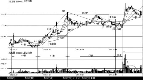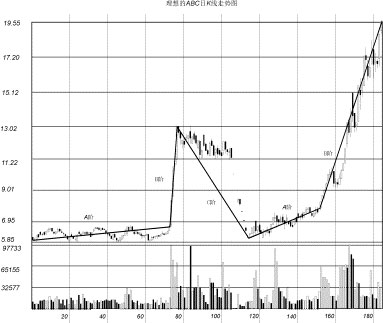 (二)上證指數(shù)三段三階的實戰(zhàn)劃分 圖2-34是上海股票市場大盤上證指數(shù)(1995年3月至2000年4月)的周K線和成交量走勢圖。 在圖2-34中: ●C0至A1組成A段。A段是莊家和跟莊者秘密收集籌碼階段,股指在低位盤整,成交量比前期放大但仍呈萎縮狀況,持續(xù)時間一年。 ●A1至B1組成B段。成交量比前期放大,經(jīng)常出現(xiàn)天量,股價呈低、中、高三臺階式上升,這是莊家和跟莊者大量吸進籌碼,拉高股價階段。持續(xù)時間1年零3個月。 ●B1至C1組成C段。這是莊家和跟莊者派貨階段,成交量比B段萎縮,股價呈高、中、低三臺階式下降,持續(xù)時間2年。 ●C0至C1組成第一個A-B-C三階循環(huán)趨勢線,持續(xù)時間約4年。 ●C1至A2組成第二個A段,持續(xù)時間4個月后,另一個三階循環(huán)趨勢線開始。 圖2-34上證指數(shù)三段三階的劃分 ●在A-B-C三循環(huán)趨勢線的劃分中,A段起始點的確定有一定難度。在后面的章節(jié)作進一步介紹。 ●圖2-34是上證指數(shù)大盤的走勢。大盤的走勢代表了大部分上海個股的走勢,是個股走勢的集合。這充分說明A-B-C三循環(huán)趨勢線分析方法的正確性,是股票走勢的共性。 ●股價是疊加在A-B-C三階循環(huán)趨勢線的隨機過程。 九、深滬二地個股三段三階劃分的案例 (一)深圳股票深寶安(0009) 圖2-35是深圳股票深寶安(0009)1995年7月至2000年5月的周K線和成交量走勢圖。 在圖2-35中: ●A至B組成B段。成交量比前期放大,經(jīng)常出現(xiàn)天量,股價呈低、中、高三臺階式上升,這是莊家和跟莊者大量吸進籌碼,投機拉高股價階段。B段持續(xù)時間約一年。 圖2-35深圳股票深寶安三段三階的劃分 ●B1至C1組成C段。這是莊家和跟莊者派貨階段,成交量比B段極度萎縮,股價呈高、中、低三臺階式下降,C段持續(xù)時間約兩年6個月。 ●C至A1組成第二個A段。成交量從萎縮到開始放大,持續(xù)時間7個月后,另一輪三循環(huán)趨勢線開始。 (二)上海股票上海石化(600689) 圖2-36是上海股票上海石化(600689)1995年7月至2000年5月的周K線和成交量走勢圖。 在圖2-36中: ●A至B組成B段。成交量比前期放大,經(jīng)常出現(xiàn)天量,股價呈低、中、高三臺階式上升,這是莊家和跟莊者大量吸進籌碼,拉高股價階段。B段持續(xù)時間約兩年。 ●B1至C1組成C段,是莊家和跟莊者的派貨階段,成交量極度萎縮,股價呈高、中、低三臺階式下降。C段持續(xù)時間約二年。 ●C至A1組成第二個A段。成交量從萎縮到開始放大。A段的持續(xù)時間約10個月。另一輪三循環(huán)趨勢線又開始。 圖2-36上海股票上海石化三段三階的劃分 十、理想的A-B-C三段循環(huán)走勢 (一)模擬理想的A-B-C三段循環(huán)走勢 圖2-37是理想的A-B-C三階循環(huán)走勢圖。這個走勢圖是從實際出發(fā),根據(jù)多張走勢圖形總結(jié)出的一個理想的A-B-C三段循環(huán)走勢圖形。這個走勢圖形也是股市操盤手追求的走勢,能用最少的成本給莊家和跟莊者帶來最大的利潤。 圖2-37模擬理想的A-B-C三段循環(huán)走勢圖 A段走勢是一個低價位的箱形震蕩走勢,股價波動在15%左右,每日成交均量和換手率在1%左右。這樣的股價變動和成交量不影響股價的向上攀升。100個交易日換手率在100%。通過換手,莊家和跟莊者收購了大量的籌碼。從圖中成交量顯示,莊家和跟莊者控制了45%以上的流通籌碼。 B段走勢是一條幾乎垂直的上升斜線。四個交易日,股價上漲了(13.02–6.5)/6.5×100%=100%,達到階段性天量,B段 結(jié)束,C段開始。 上圖的C段走勢,頭28個交易日是一個高位直角三角形震蕩走勢。三角形的直邊是股價的最大變動值,該值在高位11.22元~13.02元約16%之間波動。每日的成交均量和換手率在4%左右,相當于莊家和跟莊者每日向市場派4%(其中部分是散戶的籌碼)左右的籌碼。很顯然,這是莊家和跟莊者最理想的派貨走勢。高價派貨股價不降,28個交易日總成交量和換手率達110%以上,說明莊家和跟莊者在低位買進的籌碼在高位已基本派完。 第29個交易日,莊家和跟莊者用所剩籌碼把股價打壓,連續(xù)7個交易日股價呈無量下跌(低位無人接貨)走勢。股價從13.02元降到5.85元。跌幅(5.85–13.02)/13.02×100%=–55%,絕對值7.17元。股價打回原形達到地價,C段結(jié)束,A段 走勢開始,又開始了新一輪三段三階走勢。 圖2-37顯示了理想的三階循環(huán)走勢。在實戰(zhàn)中,A段和B段的圖形走勢是容易做到的。特別是當莊家和跟莊者收購了流通股的80%后就可以做出任何拉升走勢。有時可在一個交易日內(nèi)把股價拉升200%。但在高位如何把手中所控的籌碼賣出,達到理想的C階走勢是很難做到的。