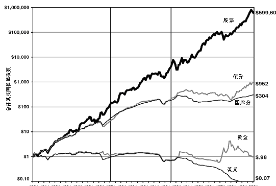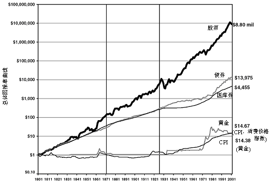 美國著名投資專家席格爾教授在他的著作《散戶投資正典(股史風(fēng)云話投資)》一書中這樣寫到“如果1802年投資1美元在股票上,并保證將投資所得再投資于股票,那么到了2001年您的財富將累積至近8,800,000美元。”他又指出“投資者在股票市場的收益大于投資長短期債券、國庫券、黃金。”
