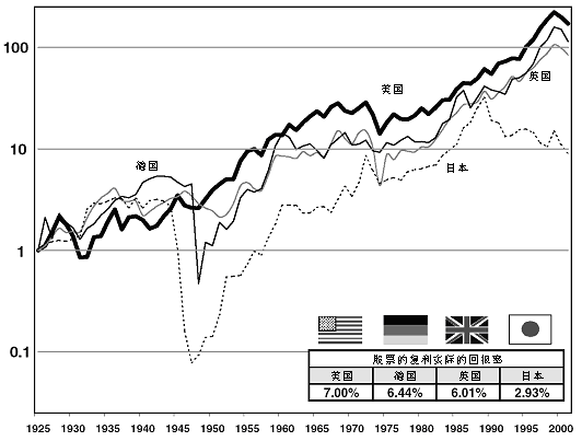 描述了美國、英國、德國和日本從1926年至今的股票實際總收益指數(shù)。很明顯,從1926到2001年的76年內(nèi),德國和英國股票的累積實際回報率走勢和美國很相近。這三個國家復(fù)利年均實際回報率的差距保持在1%之內(nèi)。
