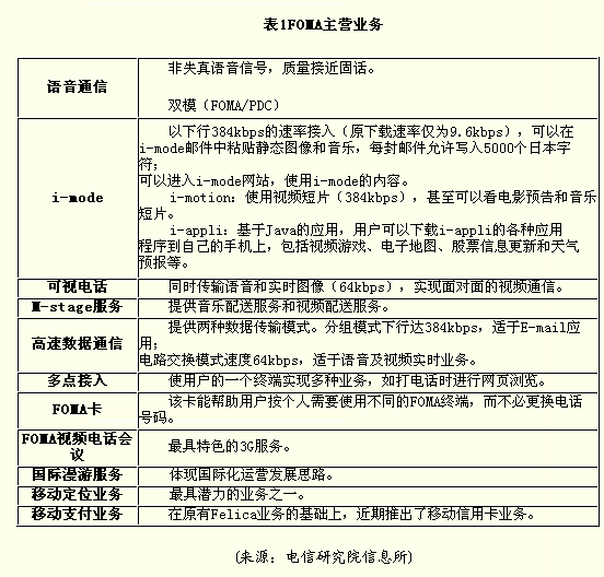 DoCoMo在3G市場推出的品牌是FOMA,其在運(yùn)營方面最大的特點(diǎn)是與其2G的i-mode業(yè)務(wù)緊密結(jié)合,使得FOMA的數(shù)據(jù)業(yè)務(wù)不僅從其原有PDC網(wǎng)絡(luò)i-mode數(shù)據(jù)業(yè)務(wù)獲得了繼承,而且在原有i-mode的基礎(chǔ)上增強(qiáng)了許多功能。NTT