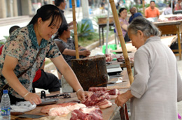 地震災(zāi)區(qū)農(nóng)貿(mào)市場供應(yīng)充足。圖為5月27日,四川平武縣一位老人在農(nóng)貿(mào)市場買肉。新華社記者:黃深鋼 攝