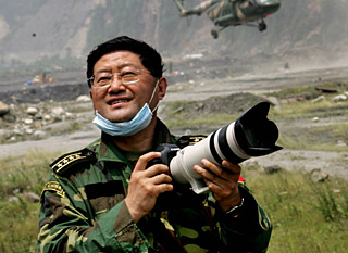 不到10公里的山路,我竟跌跌撞撞走了3個(gè)多小時(shí)。在當(dāng)?shù)貎晌恢驹刚邘椭拢医K于到達(dá)了映秀鎮(zhèn)。如果沒(méi)有他們幫我背器材,我還不知道要走多久。 疲憊不堪的我一踏上映秀鎮(zhèn),看到的只是群山中的一片廢墟,漩口中學(xué)倒塌的樓房最為明顯。在廢墟前面的空地上,躺著數(shù)不清的等待救援的傷員,還有救援部隊(duì)官兵奔波的身影,緊張的氣氛就像一部戰(zhàn)爭(zhēng)影片的場(chǎng)景。 不拋棄,不放棄!這是中國(guó)一場(chǎng)前所未有的生死大營(yíng)救,前來(lái)救援的直升機(jī)轟鳴聲在山谷里回蕩,每當(dāng)直升機(jī)一落地,官兵們就冒著彌漫的塵土,抬起擔(dān)架向直升機(jī)沖去,快速搶運(yùn)受傷群眾。在空地上等待救援的大批傷員,仰望天空,翹首企盼。 為了更多地挽救地震中受傷災(zāi)民的生命,成都軍區(qū)每天派往映秀的直升機(jī)多達(dá)幾十個(gè)架次,使大批的傷員得到及時(shí)治療。直升機(jī)還為徒步進(jìn)入的先期部隊(duì)送來(lái)了食品和淡水。 在映秀鎮(zhèn)的廢墟旁,我見(jiàn)到了濟(jì)南軍區(qū)“鐵軍”127師師長(zhǎng)楊劍,得知濟(jì)南軍區(qū)已有4萬(wàn)多名將士開(kāi)赴災(zāi)區(qū),他親自率領(lǐng)著800名“鐵軍先遣隊(duì)”連夜徒步從都江堰出發(fā),急行軍來(lái)到受災(zāi)嚴(yán)重的映秀鎮(zhèn),50多公里山路他們走了9個(gè)小時(shí)。 在映秀鎮(zhèn),遭受損失最嚴(yán)重的要屬兩所學(xué)校,一所是映秀中心小學(xué),另一所是漩口中學(xué),因?yàn)榈卣饡r(shí)學(xué)生們都在教室里上課,絕大多數(shù)學(xué)生沒(méi)來(lái)得及跑出來(lái)。 我穿過(guò)小山一樣的瓦礫,來(lái)到位于鎮(zhèn)子里面的映秀中心小學(xué)。這里靜得出奇,校舍全部倒塌,只有飄著五星紅旗的旗桿沒(méi)有倒,孤獨(dú)地立在廢墟中,空曠的操場(chǎng)上擺滿了遇難學(xué)生的遺體。一位老鄉(xiāng)告訴我,當(dāng)時(shí)有300多名孩子在這里上課,全被壓在了下面。 武警成都支隊(duì)政委李丕金,是一個(gè)令我敬佩的人。他的家鄉(xiāng)北川受災(zāi)嚴(yán)重,失去了4名親人,還有6人沒(méi)有音訊,可是他強(qiáng)忍悲痛依然帶領(lǐng)部隊(duì)官兵奮戰(zhàn)在抗震救災(zāi)第一線,從12日到16日的4天三夜,他指揮部隊(duì)搶救出600多名受災(zāi)群眾。他身先士卒,凡是艱難險(xiǎn)重的任務(wù)他都沖鋒在前。為防止災(zāi)區(qū)疫情發(fā)生,16日,部隊(duì)接到搬運(yùn)和掩埋遇難者遺體的任務(wù),李政委擔(dān)心年十八九歲的年輕戰(zhàn)士有心理障礙,他就主動(dòng)去抬第一具尸體,并進(jìn)行耐心講解,打消了官兵們心中的顧慮?粗前炯t的雙眼,同樣作為軍人的我,心中默默地向他敬了個(gè)莊嚴(yán)的軍禮! 在震中映秀采訪的兩天兩夜,令我終生難忘:沒(méi)吃、沒(méi)喝、沒(méi)地方住,沒(méi)洗過(guò)臉,沒(méi)刷過(guò)牙,沒(méi)換過(guò)衣襪,也沒(méi)刮過(guò)胡子,甚至沒(méi)有大便,因?yàn)閮商於紱](méi)吃什么東西。臉上和頭發(fā)里全是土,臉被太陽(yáng)曬得黝黑,就像回到了原始社會(huì)。隨身攜帶的一件雨衣,成了我過(guò)夜的惟一裝具。每天晚上半夜發(fā)完稿,雨衣就地一鋪,席地而睡,山里夜間氣溫變化大,總會(huì)在后半夜凍醒。 在這里,強(qiáng)烈的余震每天都有很多次,開(kāi)始還有些在意,后來(lái)就習(xí)慣了。記得第一天凌晨2點(diǎn)30左右,一次6.1級(jí)的強(qiáng)余震發(fā)生,將躺在地上的我震醒,不遠(yuǎn)處的山體滑落的巨石砸落在岷江里,發(fā)出“轟隆隆”的轟鳴聲,在寂靜的夜里,顯得如此驚心。