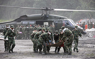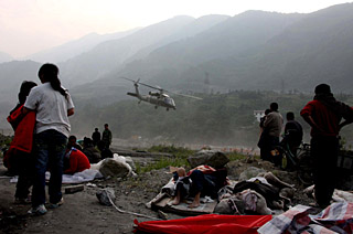 | 5月15日,映秀鎮(zhèn)的受傷群眾在等待著解放軍直升機(jī)的營(yíng)救。 |