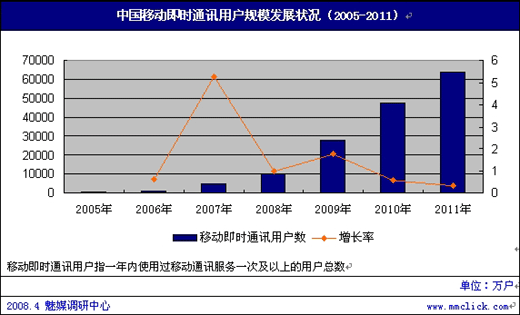 3G到來后,網(wǎng)絡(luò)和終端的提升將極大地促進無線增值業(yè)務(wù)以及無線互聯(lián)網(wǎng)的發(fā)展,移動IM面臨著大好的發(fā)展時機。 其次,個人IM市場的持續(xù)飽和,促使騰訊QQ、msn也逐漸把重心轉(zhuǎn)移到移動IM領(lǐng)域;根據(jù)賽迪顧問的統(tǒng)計數(shù)據(jù),2007年中國個人IM市場注冊賬戶數(shù)達到8億,個人IM用戶數(shù)達到1.8億人,占互聯(lián)網(wǎng)總網(wǎng)民人數(shù)的92%.第三,隨著中國手機用戶的持續(xù)增長,并且各大服務(wù)提供商推出的IM產(chǎn)品及相關(guān)軟件,已經(jīng)獲得了相當大部份用戶的肯定。魅媒調(diào)研中心發(fā)布的《中國移動即時通訊用戶規(guī)模發(fā)展狀況》數(shù)據(jù)中顯示,2007年移動通訊用戶數(shù)量已達5000萬,到2008年達1億戶,預(yù)測還將持續(xù)增長至2011年,用戶數(shù)可達4.75億。