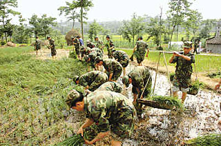 | 6月2日,在安縣塔水鎮(zhèn)油房村,某裝甲團戰(zhàn)士幫助農(nóng)民栽插秧苗。汪曉東