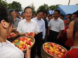 6月20日至22日,中共中央政治局常委、國(guó)務(wù)院總理溫家寶到受汶川大地震波及的陜西、甘肅災(zāi)區(qū)檢查指導(dǎo)抗震救災(zāi)工作,看望干部群眾。這是6月21日,溫家寶在甘肅隴南市康縣平洛鎮(zhèn)貫溝村大莊社視察時(shí),村民送來(lái)新摘的油桃。