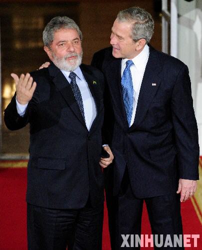 11月14日,美國(guó)總統(tǒng)布什(右)在白宮迎接前來(lái)出席二十國(guó)集團(tuán)領(lǐng)導(dǎo)人金融市場(chǎng)和世界經(jīng)濟(jì)峰會(huì)的巴西總統(tǒng)盧拉。二十國(guó)集團(tuán)領(lǐng)導(dǎo)人金融市場(chǎng)和世界經(jīng)濟(jì)峰會(huì)將于11月15日在華盛頓舉行。除二十國(guó)集團(tuán)成員領(lǐng)導(dǎo)人外,聯(lián)合國(guó)、世界銀行、國(guó)際貨幣基金組織、金融穩(wěn)定論壇等國(guó)際機(jī)構(gòu)負(fù)責(zé)人也將出席峰會(huì)。