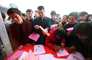 | 日前,江西贛州市在黃金廣場(chǎng)舉行萬人返鄉(xiāng)農(nóng)民工招聘大會(huì),吸引眾多農(nóng)民工到場(chǎng)應(yīng)聘。新華社發(fā)(許軍